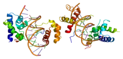 - ↑ Wang JM, Préfontaine GG, Lemieux ME, Pope L, Akimenko MA, Haché RJ (October 1999). "Developmental effects of ectopic expression of the glucocorticoid receptor DNA binding domain are alleviated by an amino acid substitution that interferes with homeodomain binding". Mol. Cell. Biol. 19 (10): 7106–22. doi:10.1128/mcb.19.10.7106. PMC 84705. PMID 10490647.
