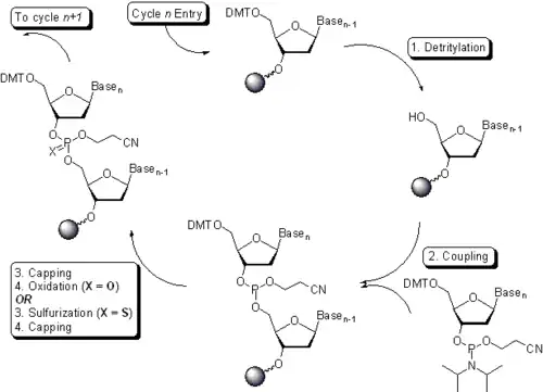Oligonucleotide synthesis is carried out by a stepwise addition of nucleotide residues to the 5'-terminus of the growing chain until the desired sequence is assembled. Each addition is referred to as a synthesis cycle (Scheme 5) and consists of four chemical reactions:
