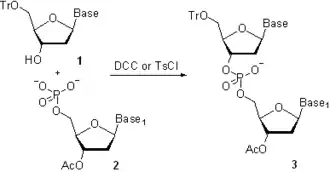In the 1950s, Har Gobind Khorana and co-workers developed a phosphodiester method where 3'-O-acetylnucleoside-5'-O-phosphate 2 (Scheme 3) was activated with N,N'-dicyclohexylcarbodiimide (DCC) or 4-toluenesulfonyl chloride (Ts-Cl). The activated species were reacted with a 5'-O-protected nucleoside 1 to give a protected dinucleoside monophosphate 3.[21] Upon the removal of 3'-O-acetyl group using base-catalyzed hydrolysis, further chain elongation was carried out. Following this methodology, sets of tri- and tetradeoxyribonucleotides were synthesized and were enzymatically converted to longer oligonucleotides, which allowed elucidation of the genetic code. The major limitation of the phosphodiester method consisted in the formation of pyrophosphate oligomers and oligonucleotides branched at the internucleosidic phosphate. The method seems to be a step back from the more selective chemistry described earlier; however, at that time, most phosphate-protecting groups available now had not yet been introduced. The lack of the convenient protection strategy necessitated taking a retreat to a slower and less selective chemistry to achieve the ultimate goal of the study.[2]