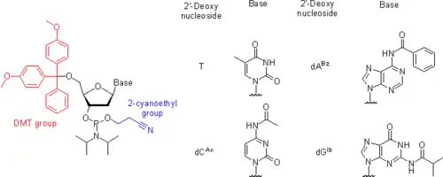 - ↑ Schulhof, J. C.; Molko, D.; Teoule, R. (1987). "The final deprotection step in oligonucleotide synthesis is reduced to a mild and rapid ammonia treatment by using labile base-protecting groups". Nucleic Acids Res. 15 (2): 397–416. doi:10.1093/nar/15.2.397. PMC 340442. PMID 3822812.