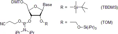 - ↑ Pitsch, S.; Weiss, P. A.; Jenny, L.; Stutz, A.; Wu, X. (2001). "Reliable chemical synthesis of oligoribonucleotides (RNA) with 2'-O-[(triisopropylsilyl)oxy]methyl(2'-O-tom)-protected phosphoramidites". Helv. Chim. Acta. 84 (12): 3773–3795. doi:10.1002/1522-2675(20011219)84:12<3773::AID-HLCA3773>3.0.CO;2-E.
