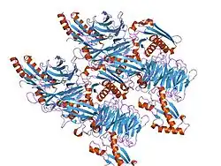 - ↑ De Mot R, Proost P, Van Damme J, Vanderleyden J (February 1992). "Homology of the root adhesin of Pseudomonas fluorescens OE 28.3 with porin F of P. aeruginosa and P. syringae". Mol. Gen. Genet. 231 (3): 489–93. doi:10.1007/BF00292721. PMID 1538702. S2CID 7518948.