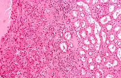 Oncocytes (left of image), as seen in a renal oncocytoma. H&E stain.