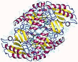 - 1 2 Shen BW, Hennig M, Hohenester E, Jansonius JN, Schirmer T (1998). "Crystal structure of human recombinant ornithine aminotransferase". J. Mol. Biol. 277 (1): 81–102. doi:10.1006/jmbi.1997.1583. PMID 9514741.