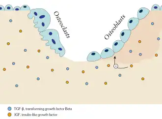 Bone is broken down by osteoclasts, and rebuilt by osteoblasts, both of which communicate through cytokine (TGF-β, IGF) signalling.