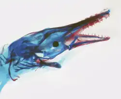 A spotted gar larva at 22 days stained for cartilage (blue) and bone (red).