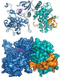 The structures of human P-TEFb containing Cdk9 and cyclin T1 and the HIV Tat•P-TEFb complex have been solved using X-ray crystallography. The first structure solved demonstrated that the two subunits were arranged as has been found in other cyclin dependent kinases.[19] Three amino acid substitutions were inadvertently introduced in the subunits used for the original structure and a subsequent structure determination using the correct sequences demonstrated the same overall structure except for a few significant changes around the active site.[20] The structure of HIV Tat bound to P-TEFb demonstrated that the viral protein forms extensive contacts with the cyclin T1 subunit (Figure 2).[20]