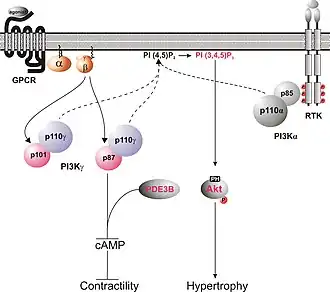 - ↑ Voigt P, Dorner MB, Schaefer M (2006). "Characterization of p87PIKAP, a novel regulatory subunit of phosphoinositide 3-kinase gamma that is highly expressed in heart and interacts with PDE3B". The Journal of Biological Chemistry. 281 (15): 9977–86. doi:10.1074/jbc.M512502200. PMID 16476736.