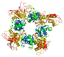 Polyadenylate-binding protein 1 is a protein that in humans is encoded by the PABPC1 gene.[5] The protein PABP1 binds mRNA and facilitates a variety of functions such as transport into and out of the nucleus, degradation, translation, and stability. There are two separate PABP1 proteins, one which is located in the nucleus (PABPN1) and the other which is found in the cytoplasm (PABPC1). The location of PABP1 affects the role of that protein and its function with RNA.[6]