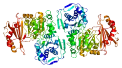 Phosphoglucomutase-1 is an enzyme that in humans is encoded by the PGM1 gene.[5][6][7] The protein encoded by this gene is an isozyme of phosphoglucomutase (PGM) and belongs to the phosphohexose mutase family. There are several PGM isozymes, which are encoded by different genes and catalyze the transfer of phosphate between the 1 and 6 positions of glucose. In most cell types, this PGM isozyme is predominant, representing about 90% of total PGM activity. In red blood cells, PGM2 is a major isozyme. This gene is highly polymorphic. Mutations in this gene cause CDG syndrome type 1t (CDG1T, formerly known as glycogen storage disease type XIV). Alternatively spliced transcript variants encoding different isoforms have been identified in this gene.[provided by RefSeq, Mar 2010][7]