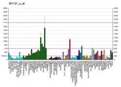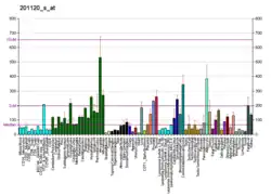 PGRMC1 is highly expressed in the liver and kidney in humans[7] with lower expression in the brain, lung, heart, skeletal muscle and pancreas.[7][16][17] In rodents, PGRMC1 is found in the liver, lung, kidney and brain.[16][17] PGRMC1 is over-expressed in breast tumors and in cancer cell lines from the colon, thyroid, ovary, lung, and cervix.[18][19] Microarray analyses have detected PGRMC1 expression in colon, lung and breast tumors.[20][21][22]