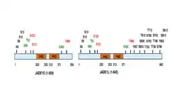 Six amino acid residues were identified to be phosphorylated in cell cycle-dependent manner via Aurora A kinase pathway.[15][16] JADE1 is a target of phosphorylation by Casein kinase 2 (CK2).[17] In addition, multiple phosphorylation sites are found by high throughput screening approaches and in silico analysis. Summary schematic for JADE1L and JADE1S protein phosphorylation sites with references is found in.[16]