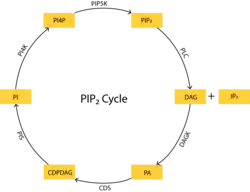 PIP2 cycle involves steps of chemical reactions characterized by various enzymes. First hydrolysis of PIP2 molecules by activated phospholipase C leads to formation of diacylglycerol and inositol trisphosphate. These two are themselves important second messengers.[4] Diacylglycerol further converted into phosphatidic acid (PA) by DAGK enzyme. Furthermore, CDP-diacylglycerol synthetase uses CTP to create cytidine diphosphate diacylglycerol from PA.[5][6] Generated CDP-DAG then condensed to PI by phosphatidylinositol synthase.[7] This PI is then phosphorylated to PI4P and back to PIP2 via action of PI4K and PIP5K[8]