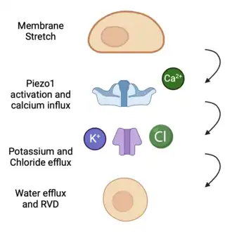 - 1 2 Michelucci A, Catacuzzeno L (July 2024). "Piezo1, the new actor in cell volume regulation". Pflügers Archiv. 476 (7): 1023–1039. doi:10.1007/s00424-024-02951-y. PMC 11166825. PMID 38581527.