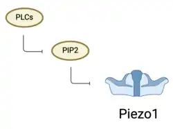 Increased intracellular calcium also activates phospholipase C (PLC), in turn hydrolyzing PIP2. The hydrolysis of PIP2 directly affects Piezo1 activity.[14] A self-limiting mechanism of Piezo1 is activity reduction caused by depletion of PIP2 in the membrane. This ensures that Piezo1 does not remain excessively active.