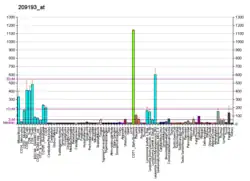 Pim-1 is a proto-oncogene which encodes for the serine/threonine kinase of the same name. The pim-1 oncogene was first described in relation to murine T-cell lymphomas, as it was the locus most frequently activated by the Moloney murine leukemia virus.[8] Subsequently, the oncogene has been implicated in multiple human cancers, including prostate cancer, acute myeloid leukemia and other hematopoietic malignancies.[9] Primarily expressed in spleen, thymus, bone marrow, prostate, oral epithelial, hippocampus and fetal liver cells, Pim-1 has also been found to be highly expressed in cell cultures isolated from human tumors.[8] Pim-1 is mainly involved in cell cycle progression, apoptosis and transcriptional activation, as well as more general signal transduction pathways.[8] Pim-1's role in oncogenic signalling has led to it becoming a widely studied target in cancer research, with numerous drug candidates under investigation which target it.[10][11]