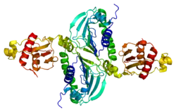 - 1 2 3 4 Shimodaira H, Yoshioka-Yamashita A, Kolodner RD, Wang JY (March 2003). "Interaction of mismatch repair protein PMS2 and the p53-related transcription factor p73 in apoptosis response to cisplatin". Proc. Natl. Acad. Sci. U.S.A. 100 (5): 2420–5. Bibcode:2003PNAS..100.2420S. doi:10.1073/pnas.0438031100. PMC 151356. PMID 12601175.