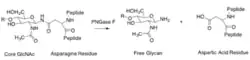 Peptide:N-glycosidase F, commonly referred to as PNGase F, is an amidase of the peptide-N4-(N-acetyl-beta-glucosaminyl)asparagine amidase class. PNGase F works by cleaving between the innermost GlcNAc and asparagine residues of high mannose, hybrid, and complex oligosaccharides from N-linked glycoproteins and glycopeptides. This results in a deaminated protein or peptide and a free glycan.[1][2]