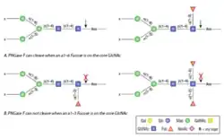 - ↑ Tarentino AL, Plummer TH (1982). "Oligosaccharide accessibility to peptide:N-glycosidase as promoted by protein-unfolding reagents". The Journal of Biological Chemistry. 257 (18): 10776–80. doi:10.1016/S0021-9258(18)33891-2. PMID 7107633.