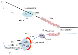- ↑ Stillman B (July 2015). "Reconsidering DNA Polymerases at the Replication Fork in Eukaryotes". Molecular Cell. 59 (2): 139–41. doi:10.1016/j.molcel.2015.07.004. PMC 4636199. PMID 26186286.