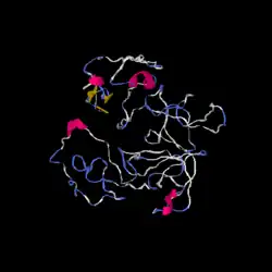 Shown to the right is a predicted tertiary structure of the protein. It is marked by long alpha-helices localized to the end of the protein opposite the N- and C- terminal ends