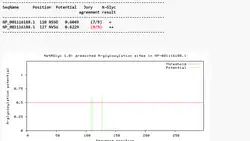 It was found that there are several post-translational modifications that are performed on PRR32. These include several N-linked glycosylation sites that were predicted with high confidence. Glycosylation is known to play a part in cell-cell adhesion ( `a mechanism employed by cells of the immune system) via sugar-binding proteins. The graph illustrates predicted N-glyc sites across the protein chain (x-axis represents protein length from N- to C-terminal). A position with a potential (vertical lines) crossing the threshold (horizontal line at 0.5) is predicted glycosylated.[12]