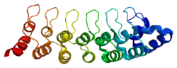 26S proteasome non-ATPase regulatory subunit 10 or gankyrin is an enzyme that in humans is encoded by the PSMD10 gene.[5] First isolated in 1998 by Tanaka et al.; Gankyrin is an oncoprotein that is a component of the 19S regulatory cap of the proteasome.[6][7] Structurally, it contains a 33-amino acid ankyrin repeat that forms a series of alpha helices.[8] It plays a key role in regulating the cell cycle via protein-protein interactions with the cyclin-dependent kinase CDK4. It also binds closely to the E3 ubiquitin ligase MDM2, which is a regulator of the degradation of p53 and retinoblastoma protein, both transcription factors involved in tumor suppression and found mutated in many cancers.[9] Gankyrin also has an anti-apoptotic effect and is overexpressed in certain types of tumor cells such as hepatocellular carcinoma.[10]
