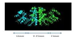 PanK-II contains two protein domains, as illustrated in Figure 1. The A domain and A' domain each has a glycine-rich loop (sequence GXXXXGKS; P loop) that is characteristic of nucleotide-binding sites; this is where ATP is assumed to bind.[7] located between residues 95 and 102 on the A domain