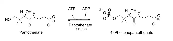 Pantothenate kinase (EC 2.7.1.33, PanK; CoaA) is the first enzyme in the Coenzyme A (CoA) biosynthetic pathway. It phosphorylates pantothenate (vitamin B5) to form 4'-phosphopantothenate at the expense of a molecule of adenosine triphosphate (ATP). It is the rate-limiting step in the biosynthesis of CoA.[1][2]