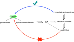 Because PanK2 is so strongly inhibited by acetyl-CoA, an abundant metabolite in the mitochondria, this enzyme likely would not be active under physiological conditions without activators.[6] Palmitoyl-carnitine and other long-chain acyl-carnitines can reverse acetyl-CoA inhibition and can activate PanK2 without acetyl-CoA present. Palmitoyl-carnitine is competitive with acetyl-CoA.[20] The activation of PanK2 by palmitoyl-carnitine and other long-chain acyl-carnitines sheds light on the regulatory pathways of this enzyme: Under normal conditions, PanK2 is likely inhibited by high levels of acetyl-CoA. Without CoA production, fatty acid oxidation decreases, leading to an increase in long-chain acyl-carnitines.[19] These acyl-carnitines can then reduce inhibition by acetyl-CoA, activating PanK2 and increasing CoA biosynthesis. PanK3 is also activated by palmitoyl-carnitine and other long-chain acyl-carnitines, including oleoyl-carnitine.[21]
