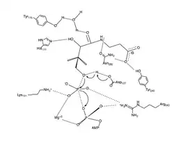 In the active site, pantothenate is oriented by hydrogen bonds between pantothenate and the side chains of aspartate, tyrosine, histidine, tyrosine, and asparagine residues.[8] Asparagine, histidine, and arginine residues are involved in catalysis.