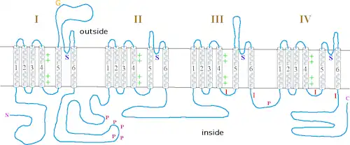 This proteins forms a sodium-selective ion channel, that relies on an electrochemical gradient.[1] The protein consists of four homology domains, HD1, HD2, HD3 and HD4. Each homology domain has six alpha helical segments, S1-S6.[6] The small alpha-helical region between S5 and S6 is known as the channel pore. Mutations within this region may be responsible for ion selectivity.[6] The cytoplasmic loop between HD3 and HD4 is responsible for fast inactivation and blocking conductance.[6] The voltage sensor 4 in HD III is partially formed by exon L and K.[7] The alternative splicing at this locus causes a difference in the charged current at this channel.[7] Exon L produces 8% of the transient current, which falls to 2% when the K exon is incorporated.[7]