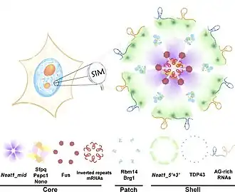 Paraspeckles are organised into core-shell spheroidal structures; seven proteins on a scaffold of lncRNA NEAT1 (the 23kb isoform termed NEAT1_2 or NEAT1v2).[8] In 2016, West et al. proposed the currently accepted model for Paraspeckles. This was based on their current findings using super-resolution microscopy.[7] Their models state that the NEAT1_2 scaffold folds into a V-shaped unit. Many of these units then are assembled into a core-shell spheroid by FUS proteins. Core proteins SFPQ, NONO and PSPC1 tightly associate to the assembled structure. Finally, the shell forms, composed of partially co-localised TDP43 proteins. Due to the integral nature of NEAT1 to paraspeckles assembly, assembly is thought to occur in close proximity to NEAT1 transcription sites.[8]