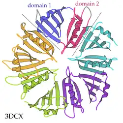 Many viral capsids are formed by hexameric and pentameric proteins.[2] Such capsids are assigned a triangulation number (T-number) which describe relation between the number of pentagons and hexagons.
