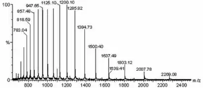 The output received from a mass spectrometer comes in the form of a peak list. This spectrum shows the masses and relative abundances of the peptide fragments present in the sample. In reading a spectrum like the one shown, all possible major fragmentations of a protein would need to be considered. Then the masses of those fragments would correlate to the numbers in the peaks of the spectrum. While it can be analyzed to some degree on its own, in forming a peptide-mass fingerprint, the peak list is run through a database search to find homologous peptide sequences.