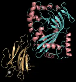 Perforin is a pore forming cytolytic protein found in the granules of cytotoxic T lymphocytes (CTLs) and natural killer cells (NK cells). Upon degranulation, perforin molecules translocate to the target cell with the help of calreticulin, which works as a chaperone protein to prevent perforin from degrading. Perforin then binds to the target cell's plasma membrane via membrane phospholipids while phosphatidylcholine binds calcium ions to increase perforin's affinity to the membrane.[8] Perforin oligomerises in a Ca2+ dependent manner to form pores on the target cell. The pore formed allows for the passive diffusion of a family of pro-apoptotic proteases, known as the granzymes, into the target cell.[9] The lytic membrane-inserting part of perforin is the MACPF domain.[10] This region shares homology with cholesterol-dependent cytolysins from Gram-positive bacteria.[11]