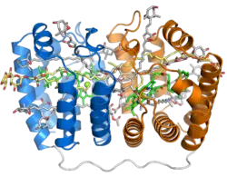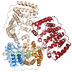 ![]() Crystal structure of the soluble peridinin-chlorophyll-protein complex from the photosynthetic dinoflagellate Amphidinium carterae. This complex is found in many photosynthetic dinoflagellates and involves a boat or cradle-shaped protein with two pseudosymmetrical repeats of eight alpha helices (shown in blue and orange) wrapped around a pigment-filled central cavity. Each eight-helix segment binds one chlorophyll molecule (green, with central magnesium ion shown as a green sphere), one diacylglycerol molecule (yellow) and four peridinin molecules (gray).[1] | |||||||||