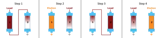 In conventional affinity chromatography, a single chromatography column is loaded with feed material up to the point before target material (product) cannot be retained by the affinity material anymore. The resin with the adsorbed product on it is then washed to remove impurities. Finally, the pure product is eluted with a different buffer. Notably, if too much feed material is loaded onto the column, the product can break through and product is consequently lost. Therefore, it is very important to only partially load the column to maximize the yield.