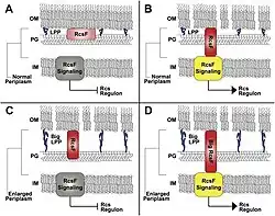 The compartmentalization afforded by the periplasmic space gives rise to several important functions. Aside from those previously mentioned, the periplasm also functions in protein transport and quality control, analogous to the endoplasmic reticulum in eukaryotes.[17] Furthermore, the separation of the periplasm from the cytoplasm allows for the compartmentalization of enzymes that could be toxic in the cytoplasm.[17] Some peptidoglycans and lipoproteins located in the periplasm provide a structural support system for the cell that aids in promoting the cell's ability to withstand turgor pressure. Notably, organelles such as the flagellum require the assembly of polymers within the periplasm for proper functioning. As the driveshaft of the flagellum spans the periplasmic space, its length is dictated by positioning of the outer membrane as induced by its contraction, which is mediated by periplasmic polymers.[17] The periplasm also functions in cell signaling, such as in the case of the lipoprotein RcsF, which has a globular domain residing in the periplasm and acts as a stress sensor. When RcsF fails to interact with BamA, such as in the case of an enlarged periplasm, RcsF is not exported to the cell surface and are able to trigger the Rcs signaling cascade. Periplasm size, therefore, plays an important role in stress signaling.[18][17]