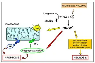 - ↑ Pacher, P; Beckman, J. S; Liaudet, L (2007). "Nitric oxide and peroxynitrite in health and disease". Physiological Reviews. 87 (1): 315–424. doi:10.1152/physrev.00029.2006. PMC 2248324. PMID 17237348.