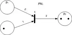 Some definitions of Petri nets explicitly allow this as a syntactic feature.[13] Formally, Petri nets with place capacities can be defined as tuples , where is a Petri net, an assignment of capacities to (some or all) places, and the transition relation is the usual one restricted to the markings in which each place with a capacity has at most that many tokens.