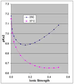 Phillips et al.[5] measured the pKa at 10, 25, and 37 °C at various ionic strengths. For the latter two temperatures they report pKa in Debye-Hückel equations (plotted in the accompanying figure for μ up to 0.5 M):