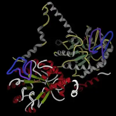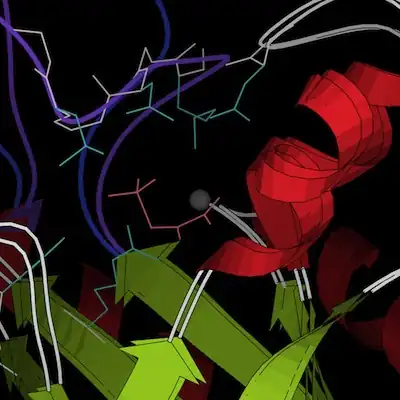 The two conformations, taken from the crystal structures 1M1B (closed) and 1S2T (open), are docked into each other in the images below; they differ negligibly except in the gating loop, which is colored purple for the closed conformation and blue for the open conformation. In the active-site closeup (left), several sidechains (cyan) that have been identified as important in catalysis are included as well; the overview (right) illustrates the distinctive helix-swapping fold. The images are still shots from ribbon kinemages. Both of these structures were crystallized as dimers. In chain A (used for the active-site closeup), helices are red while loops (other than the gating loop) are white and beta strands are green; in chain B, helices are yellow, beta strands are olive, and loops are gray; these colors are the same for the closed and open structures. Magnesium ions are gray and the sulfopyruvate ligands are pink; both are from the closed structure (though the enzyme has also been crystallized with only magnesium bound, and it adopted an open conformation).