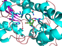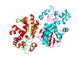 PGM is an isomerase enzyme, effectively transferring a phosphate group (PO43−) from the C-3 carbon of 3-phosphoglycerate to the C-2 carbon forming 2-phosphoglycerate. There are a total of three reactions dPGM can catalyze: a mutase reaction resulting in the conversion of 3PG to 2PG and vice versa,[4][5] a phosphatase reaction creating phosphoglycerate from 2,3-bisphosphoglycerate,[6][7] and a synthase reaction producing 2,3-bisphosphoglycerate from 1,3-bisphosphoglycerate similar to the enzyme bisphosphoglycerate mutase. Kinetic and structural studies have provided evidence that indicate dPGM and bisphosphoglycerate mutase are paralogous structures.[6] Both enzymes are contained in the superfamily that also contains the phosphatase portion of phosphofructokinase 2 and prostatic acid phosphatase.[8]