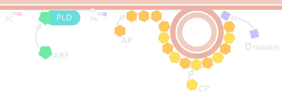 PLD1 is a 120 kDa protein that is mainly located on the inner membranes of cells. It is primarily present at the Golgi complex, endosomes, lysosomes, and secretory granules.[6] Upon the binding of an extracellular stimulus, PLD1 is transported to the plasma membrane. Basal PLD1 activity is low however, and in order to transduce the extracellular signal, it must first be activated by proteins such as Arf, Rho, Rac, and protein kinase C.[6][9][12]