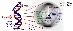 - ↑ "The instant I saw the picture my mouth fell open and my pulse began to race." James D. Watson (1968), The Double Helix, page 167. New York: Atheneum, Library of Congress card number 68-16217. Page 168 shows the X-shaped pattern of the B-form of DNA which provided details of the helical structure of DNA to both scientists Watson and Crick.