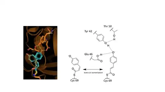 Hydrogen bonds in proteins such as PYP take part in interrelated networks, where at the center of p-coumaric acid's phenolate O4 atom, there is an oxyanion hole that is crucial for photosensory function.[6][11][12] Oxyanion holes exist in enzymes to stabilize transitions states of reaction intermediates, thus stabilizing the trans–cis isomerization of p-coumaric acid.[5][13] During the transition state it is believed that the p-coumaric acid phenolate O4 takes part in a hydrogen bond network between Glu46, Tyr42 and Thr50 of PYP.[13][5] These interactions are apart from the thiol ester linkage to Cys 69 keeping p-coumaric acid in the ligand binding site.[3] Upon transitioning to the cis-isomeric form of p-coumaric acid the favorable hydrogen bonds are no longer in close interaction.
