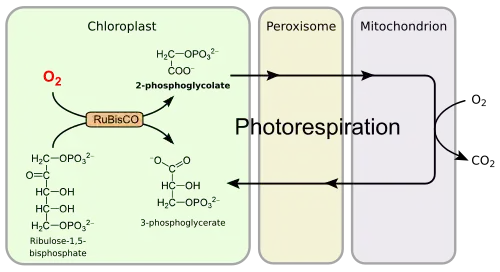 Photorespiration (also known as the oxidative photosynthetic carbon cycle or C2 cycle) refers to a process in plant metabolism where the enzyme RuBisCO oxygenates RuBP, wasting some of the energy produced by photosynthesis. The desired reaction is the addition of carbon dioxide to RuBP (carboxylation), a key step in the Calvin–Benson cycle, but approximately 25% of reactions by RuBisCO instead add oxygen to RuBP (oxygenation), creating a product that cannot be used within the Calvin–Benson cycle. This process lowers the efficiency of photosynthesis, potentially lowering photosynthetic output by 25% in C3 plants.[1] Photorespiration involves a complex network of enzyme reactions that exchange metabolites between chloroplasts, leaf peroxisomes and mitochondria.