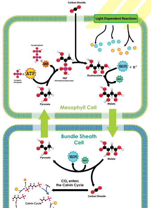 Plants that use the C4 carbon fixation process chemically fix carbon dioxide in the cells of the mesophyll by adding it to the three-carbon molecule phosphoenolpyruvate (PEP), a reaction catalyzed by an enzyme called PEP carboxylase, creating the four-carbon organic acid oxaloacetic acid. Oxaloacetic acid or malate synthesized by this process is then translocated to specialized bundle sheath cells where the enzyme RuBisCO and other Calvin cycle enzymes are located, and where CO2 released by decarboxylation of the four-carbon acids is then fixed by RuBisCO activity to the three-carbon 3-phosphoglyceric acids. The physical separation of RuBisCO from the oxygen-generating light reactions reduces photorespiration and increases CO2 fixation and, thus, the photosynthetic capacity of the leaf.[31] C4 plants can produce more sugar than C3 plants in conditions of high light and temperature. Many important crop plants are C4 plants, including maize, sorghum, sugarcane, and millet. Plants that do not use PEP-carboxylase in carbon fixation are called C3 plants because the primary carboxylation reaction, catalyzed by RuBisCO, produces the three-carbon 3-phosphoglyceric acids directly in the Calvin-Benson cycle. Over 90% of plants use C3 carbon fixation, compared to 3% that use C4 carbon fixation;[32] however, the evolution of C4 in over sixty plant lineages makes it a striking example of convergent evolution.[30] C2 photosynthesis, which involves carbon-concentration by selective breakdown of photorespiratory glycine, is both an evolutionary precursor to C4 and a useful carbon-concentrating mechanism in its own right.[33]