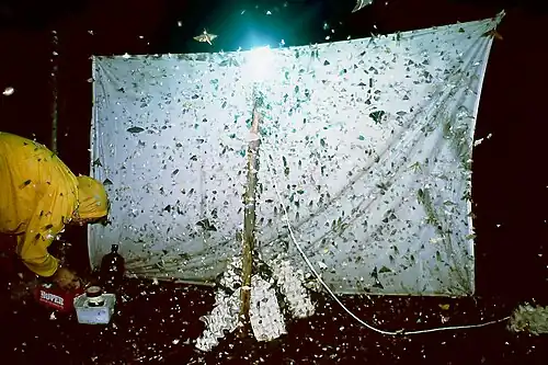Positive phototaxis can be found in many flying insects such as moths, grasshoppers, and flies. Drosophila melanogaster has been studied extensively for its innate positive phototactic response to light sources, using controlled experiments to help understand the connection between airborne locomotion toward a light source.[65] This innate response is common among insects that fly primarily during the night utilizing transverse orientation vis-à-vis the light of the moon for orientation.[66] Artificial lighting in cities and populated areas results in a more pronounced positive response compared to that with the distant light of the moon, resulting in the organism repeatedly responding to this new supernormal stimulus and innately flying toward it.